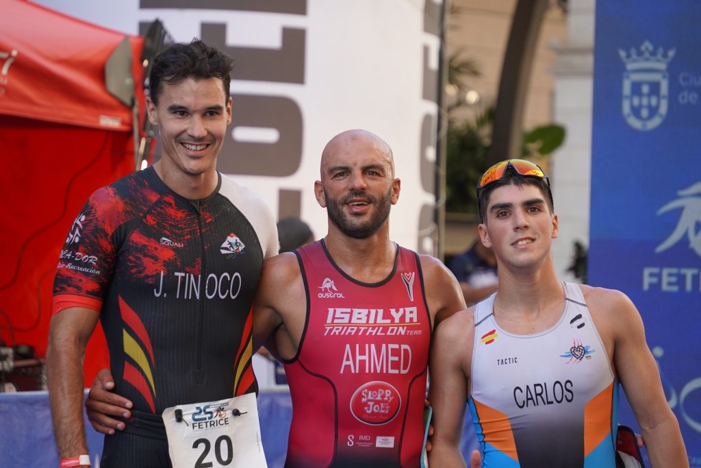 En la prueba local, en la que han competido 70 participantes, Vilal Ahmed se ha erigido como campeón, tras una natación controlada y un tramo de ciclismo de alta intensidad, ha rematado en la carrera a pie y se ha impuesto en el Campeonato Autonómico con un tiempo de 1:00:50. A su estela han entrado Javier Tinoco y Carlos Martínez, que han completado el podio de la prueba popular.